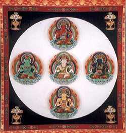 此五尊的三昧耶形,分别为率堵婆、五钴杵、如意宝、莲华、羯磨。其种子依次为vam、hu^m、tra^h!、hri^h!、ah!等五字。