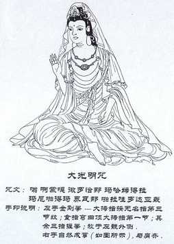 第一印为菩提心印。乃教学人立大志、发大愿,上求佛道,下化众生,巩固修道之初心。如造百丈高楼,须先打好地基,基础如不牢固,楼要倒塌。学道如不立大志,不发大愿,势必知难而退,遇挫即止,绝不能百折不挠地奋斗到底,证成圣果。所以此印最为重要,在密宗的一万六千余种手印中,以此印为诸印之王。