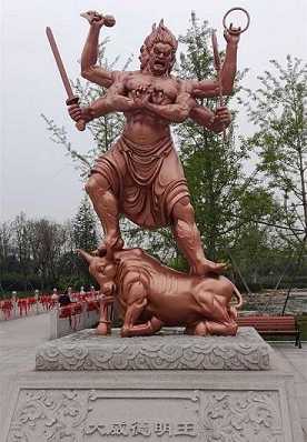 大威德明王:梵名阎曼德迦,别称降焰魔尊,有大威德力,能断除一切魔障,摧伏一切毒龙。六臂六首六足。镇守西方。