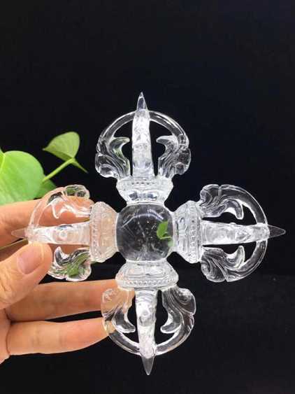 羯磨杵,也称十字金刚杵。它是由四个带有莲花座的金刚杵组成的,四个金刚杵的杵头从中心点向四方散射,象征着绝对的定力。在对须弥山的描述中,巨大的羯磨杵承托着物质宇宙。同样,它也被描述成坛城宫不可撼动的支撑物。传统上,德高望重的佛教大师所坐的高高隆起的木制宝座前面都有一块方形锦缎,其中央处都有一个彩色羯磨杵图,四角装饰以四个小卍字符。