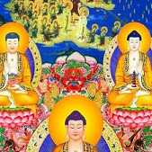 另外“阿弥陀佛”的梵文意思可理解为“光明、智慧、长寿”,这样的话此佛号也表示了一种祝福,祝您“光寿无量”。我们知道在横三世佛中,每位佛陀都有两位菩萨胁持(协助完成发愿功德),民间最有名的大悲观世音菩萨就是阿弥陀佛的胁持菩萨之一,还有一位是大势至菩萨,他们三位又合称为“西方三圣”