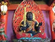 不动明王,即不动尊菩萨,其名号梵音为Acalanatha,意为不动尊或无动尊,教界称为“不动明王”,亦谓之不动使者。“不动”,乃指慈悲心坚固,无可撼动,“明”者,乃智慧之光明,“王”者,驾驭一切现象者。依密教三轮身之分类而总判,不动明王为一切诸佛教令轮身,故又称为诸明王之王,五大明王之主尊。就金刚胎藏两部而分别其德,五方佛,各有三轮身。中央毗如遮那佛为自性轮身,金刚般若蜜多菩萨为正身,不动明王为教令轮身。所以不动明王是奉大日如来教令,示现忿怒形降伏一切恶魔之大威势明王。他的身相是对那些顽固不化、执迷不误、受魔障遮蔽的众生而变化的,以喝醒众生和吓退魔障。